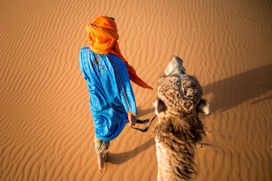“ยูสซุฟกับอูฐหนอกเดียวของเขากำลังเดินทางระหว่างหมู่บ้านเล็กๆชื่อ Merzouga กับเนินทราย Erg Chebbi ตั้งแต่มีการพัฒนาการท่องเที่ยวในภูมิภาคนี้ ครอบครัวชนเผ่าเร่ร่อนอย่างครอบครัวของเขาก็เลิกอาศัยในทะเลทรายเพื่อมาลงหลักปักฐานในหมู่บ้าน” – Benjamin Dugone Photograph by Benjamin Dugone, National Geographic Your Shot