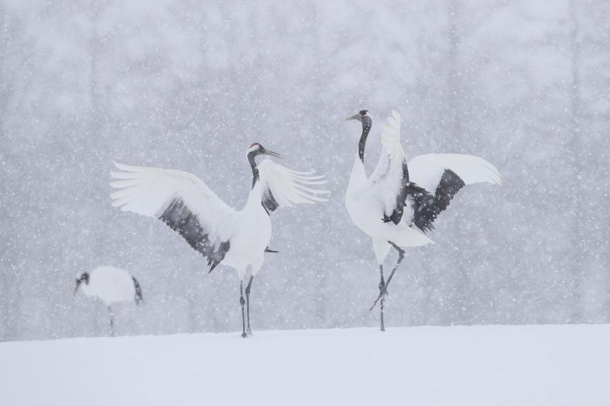“นกกระเรียนสองตัวเกี้ยวพาราสีกันโดยการเต้นรำท่ามกลางหิมะ” – Hiroto Fukuda Photograph by Hiroto Fukuda, National Geographic Your Shot