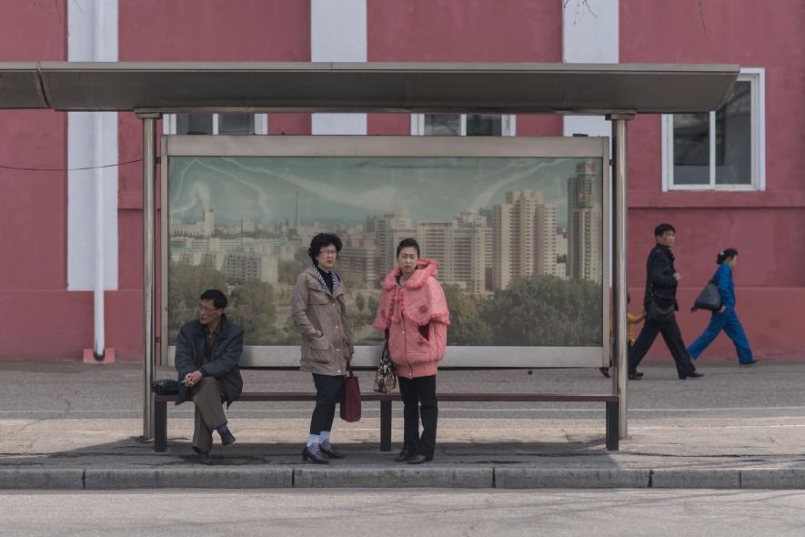 ภาพถ่ายของชาวเกาหลีเหนือที่กำลังรอรถประจำทางที่ป้ายหยุดรถ ในกรุงเปียงยางภาพนี้ถูกบันทึกโดย Ed Jones แม้ว่าบรรยากาศของการรอรถจะดูน่าเบื่อ แต่ดูที่จุดจอดรถประจำทางให้ดี เพราะแทนที่จะเต็มไปด้วยภาพโฆษณาหรือกราฟฟิตี้ ที่เกาหลีเหนือกลับเลือกใช้ภาพของวิวทิวทัศน์หรือเมืองอันสวยงามแทน