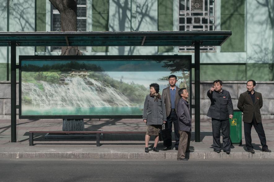 ภาพถ่ายของชาวเกาหลีเหนือที่กำลังรอรถประจำทางที่ป้ายหยุดรถ ในกรุงเปียงยางภาพนี้ถูกบันทึกโดย Ed Jones แม้ว่าบรรยากาศของการรอรถจะดูน่าเบื่อ แต่ดูที่จุดจอดรถประจำทางให้ดี เพราะแทนที่จะเต็มไปด้วยภาพโฆษณาหรือกราฟฟิตี้ ที่เกาหลีเหนือกลับเลือกใช้ภาพของวิวทิวทัศน์หรือเมืองอันสวยงามแทน