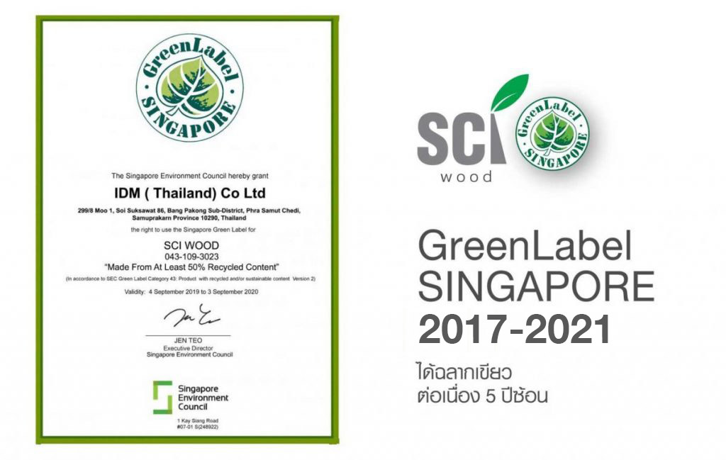 อย่างไม้ Sci Wood ที่ได้รับฉลากเขียวจากสภาสิ่งแวดล้อมแห่งประเทศสิงคโปร์ ต่อเนื่อง 5 ปี ติดต่อกัน โดยได้รับการระบุว่า เป็นสินค้าที่เป็นมิตรกับสิ่งแวดล้อม (Eco-Product) หมายถึง ผลิตภัณฑ์ที่ผลิตด้วยขั้นตอนที่มุ่งประหยัดพลังงาน และลดมลพิษระหว่างการใช้งาน ช่วยให้ปลอดภัยต่อผู้บริโภคมากขึ้น โดยเป็นผลิตภัณฑ์ที่ออกแบบมาเพื่อให้สามารถนำวัสดุกลับมารีไซเคิลใหม่ หรือคืนสภาพ (Recovery) ได้
