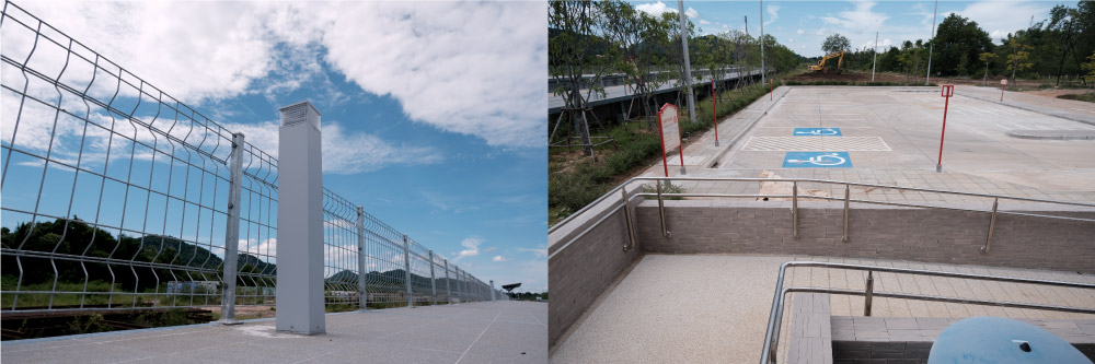 รั้วกั้นตลอดแนวเส้นทางและชานชาลาเพิ่มความปลอดภัย (ซ้าย) ที่จอดรถผู้พิการ เชื่อมต่อทางลาดให้ใช้งานสะดวก (ขวา)