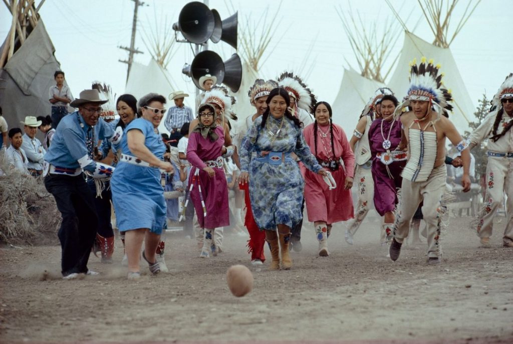 ภาพนี้มาจากฉบับเมษายน 1966 คู่รักผูกข้อมือติดกัน พร้อมกับวิ่งไล่ล่าลูกบอลระหว่างการแข่งขันเกมในงาน All-American Indian Days ในเมือง Sheridan รัฐไวโอมิง ชนพื้นเมืองทั่วทั้งอเมริกาต่างก็เข้าร่วมงานเทศกาลประจำปีแห่งนี้ จนกระทั่งงานสิ้นสุดลงในปี 1984