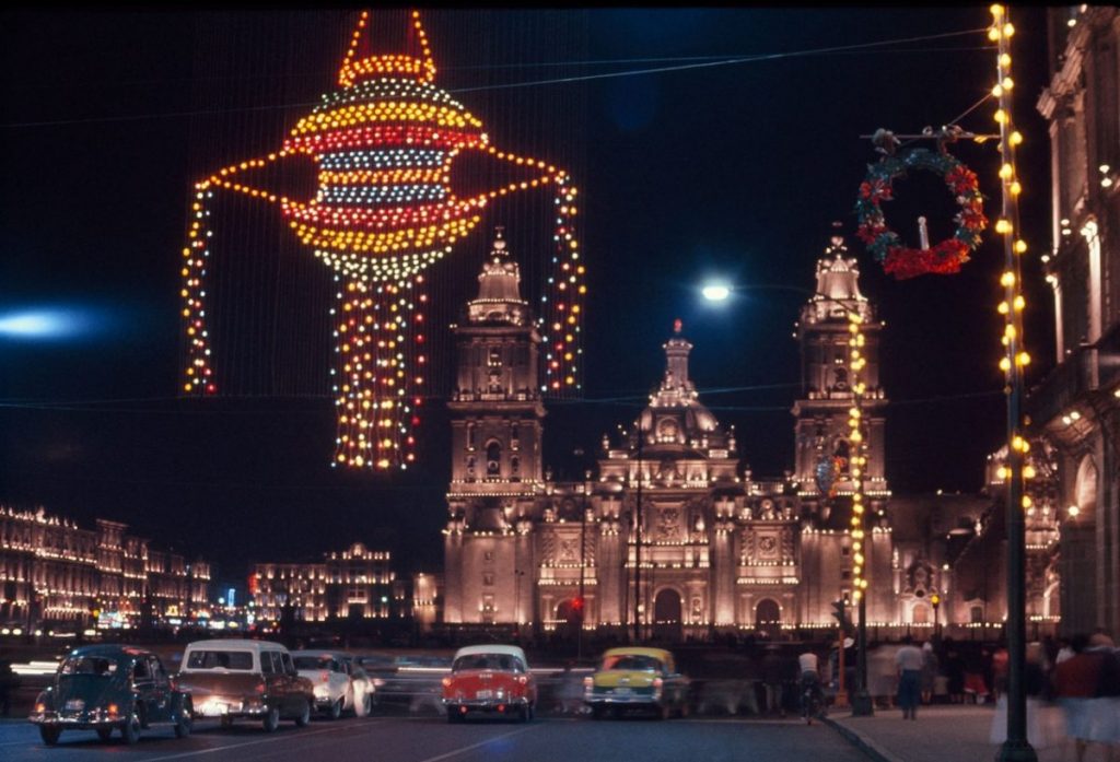 ไฟประดับประดาทั่วทั้งเมือง Zócalo แห่งเม็กซิโกซิตี้ ภาพนี้ถูกบอกเล่าผ่านหัวข้อ เม็กซิโกในความเคลื่อนไหว ฉบับตุลาคม 1961 ด้วยเรื่องราวเกี่ยวกับความก้าวหน้าของประเทศที่พัฒนาขึ้น ร่วมไปกับการอุทิศตนเพื่อประเพณีดั้งเดิม