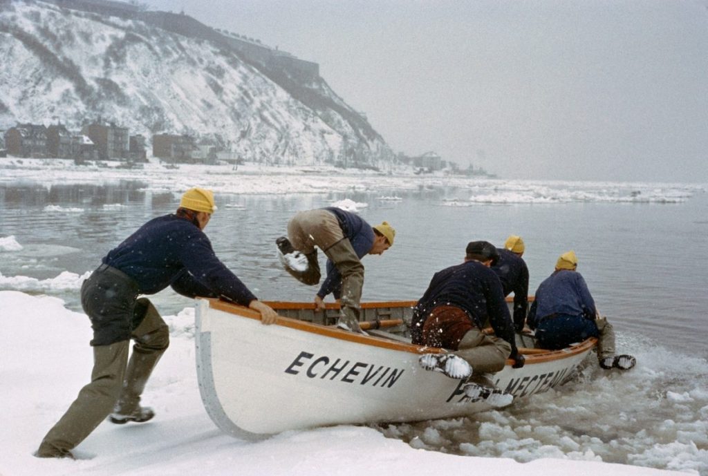ชายหนุ่มผลักเรือแคนูเข้าไปยังแม่น้ำ St.Lawrence ใน Quebec ประเทศแคนาดา เพื่อฝึกซ้อมสำหรับการแข่งขันซึ่งเป็นส่วนหนึ่งของงานรื่นเริงฤดูหนาวของเมือง งานเทศกาลนี้เป็นเรื่องเด่นในฉบับมกราคม 1958