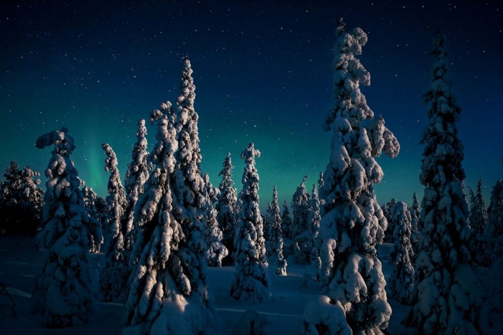 แสงเหนือส่องระยิบระยับเหนือต้นสนที่ปกคลุมไปด้วยหิมะในเขตอุทยานแห่งชาติ Oulanka ของฟินแลนด์ เรื่องราวจากฉบับมิถุนายน 2009 แสดงทัศนียภาพอันน่าทึ่งของอุทยานอันเป็นที่รักแห่งนี้ตลอดสี่ฤดูกาล