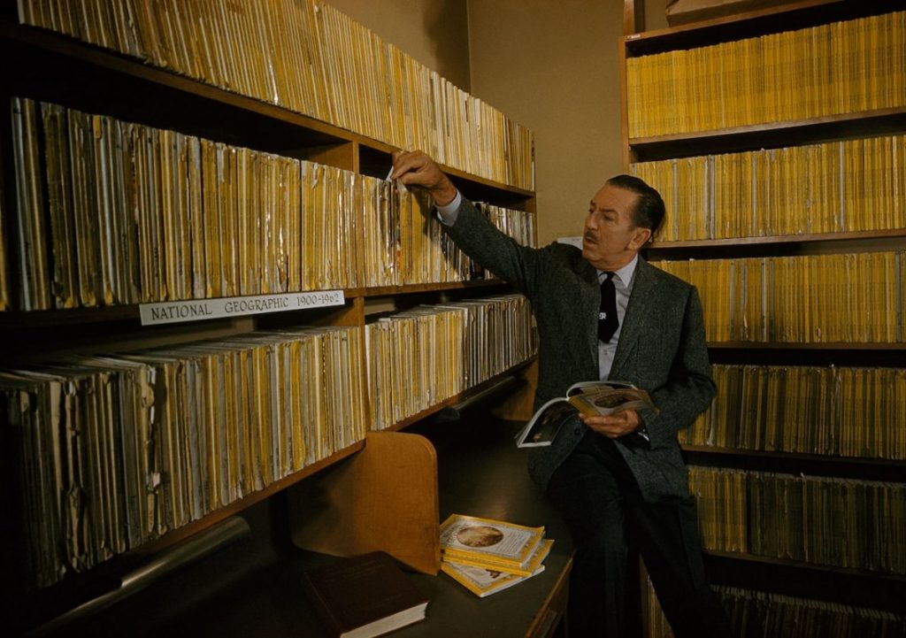 เรื่องราวฉบับสิงหาคม 1963 รวบรวมประวัติของวอลท์ ดิสนีย์ พร้อมกับบันทึกกิจการภายใต้ชื่อของเขา ในภาพนี้ วอล์ท ดิสนีย์ กำลังค้นดูเอกสารสำคัญของ National Geographic เพื่อค้นหาเครื่องแต่งกายย้อนยุคสำหรับภาพยนตร์ (บริษัท Walt Disney เป็นเจ้าของใหญ่ของ National Geographic Partners)
