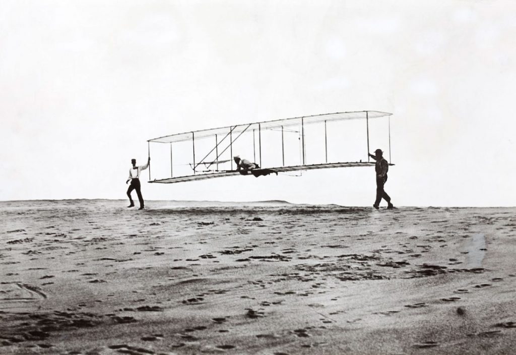 พี่น้องตระกูล Wright ทำการบินครั้งแรกเมื่อปี 1903 Orville เป็นผู้ควบคุมเครื่องบินด้วยท่าทางนอนหงายเพื่อลดแรงต้านลม ขณะที่ Willbur วิ่งเคียงข้างไปด้วย เที่ยวบินนี้กินเวลา 12 วินาที และครอบคลุมระยะทาง 120 ฟุต