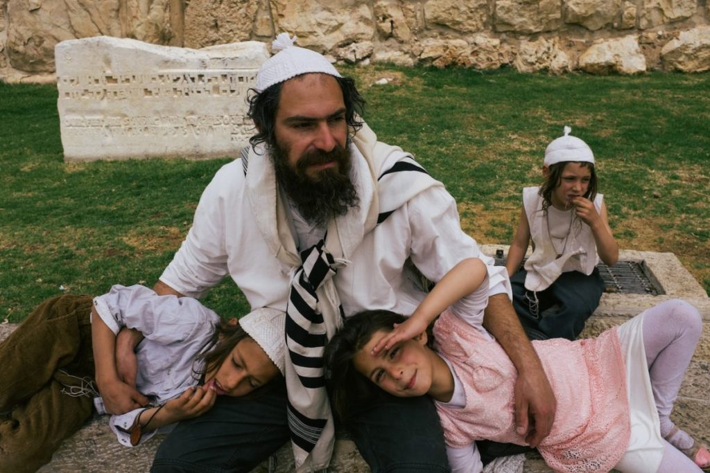 ชายชาวยิวกับลูกๆ กำลังนั่งพักอยู่ใกล้กับย่านชาวยิวของเมืองเก่าแก่แห่งเยรูซาเลม เบื้องหลังกำแพงที่รายล้อมรอบคือเมืองเก่าที่กำลังก้าวสู่ยุคสมัยใหม่ พร้อมกับเป็นที่ตั้งของสถานที่ศักดิ์สิทธิ์ของชาวยิว อิสลาม และคริสต์
