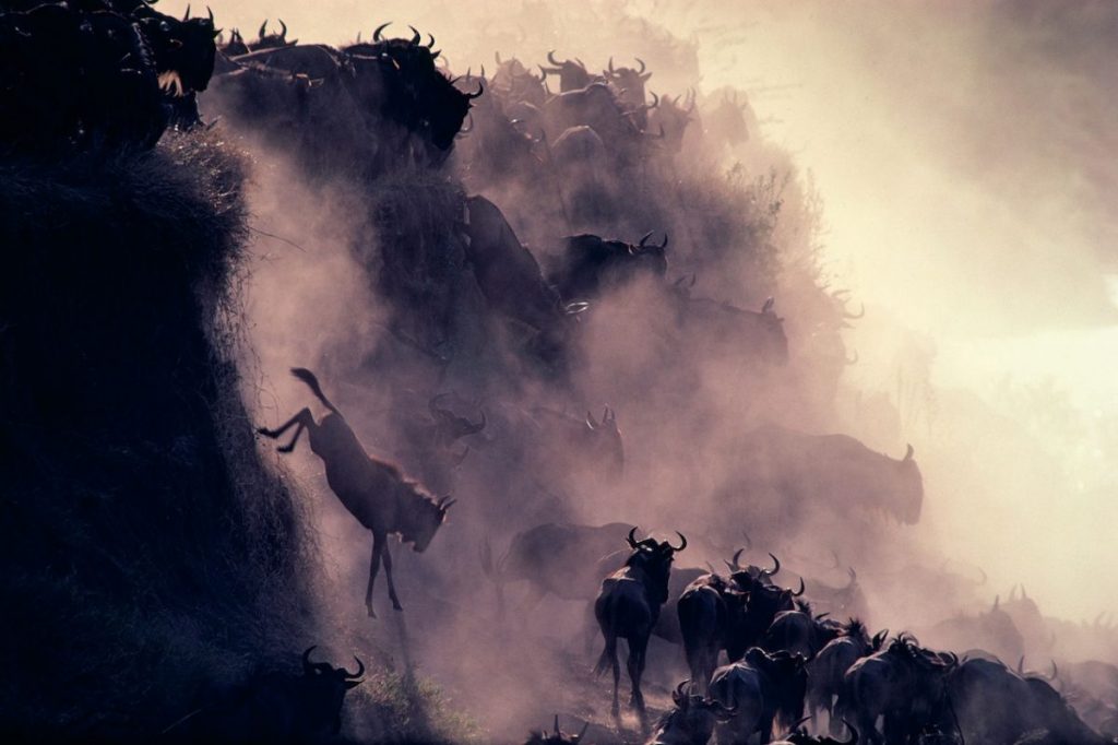 ภาพนี้มาจากฉบับเดือนพฤษภาคม 1986 ฝูงวิลเดอบีสต์จำนวนมหาศาลอพยพข้ามแม่น้ำในเซเรงเกติระหว่างการย้ายถิ่นประจำปี ทุกปีเหล่าสัตว์จะเดินทางอพยพเป็นระยะทางราว 500 ไมล์ เพื่อค้นหาพื้นที่สีเขียวสำหรับเป็นแหล่งหญ้าอาหารในช่วงฤดูฝน