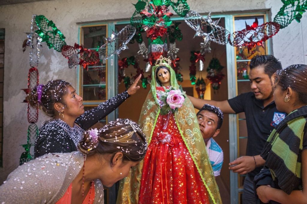 ในเมือง Puebla ประเทศเม็กซิโก ชาวเมืองจัดขบวนพาเหรดสำหรับพระแม่มารีระหว่างงานฉลอง Guadalupe รูปปั้นเช่นนี้จะถูกหามไปยังโบสถ์ ขอพร และแลกเปลี่ยนกันระหว่างครอบครัว