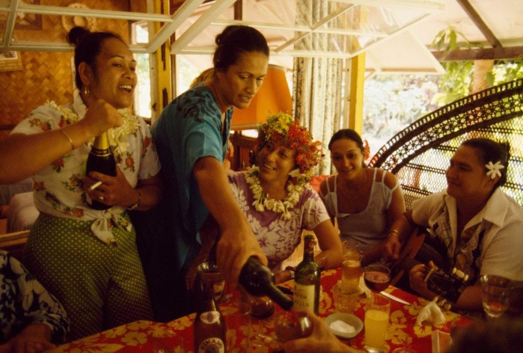 แชมเปญถูกรินลงแก้วสำหรับงานเลี้ยงวันเกิดใน Mo’orea หมู่เกาะโซไซตี้ โพลินีเซีย เรื่องราวของหมู่เกาะแห่งนี้ในฉบับมิถุนายน 1979 ซึ่งแสดงให้เห็นภูมิทัศน์อันน่าทึ่งและวัฒนธรรมอันกว้างขวางครอบคลุมสังคมและเศรษฐกิจ