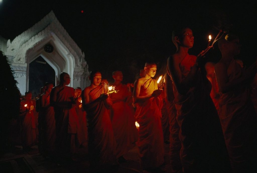 พระสงฆ์เดินเวียนเทียนพร้อมกับถือเทียน ธูป และดอกบัว ภายในบริเวณวัดเบญจมพิตรดุสิตวนารามราชวรวิหาร ภาพนี้ปรากฏครั้งแรกในฉบับกุมภาพันธ์ 1996 ว่าด้วยเรื่องราวการเปลี่ยนแปลงทางวัฒนธรรมในประเทศไทย อันเป็นผลมาจากการท่องเที่ยวที่เฟื่องฟู