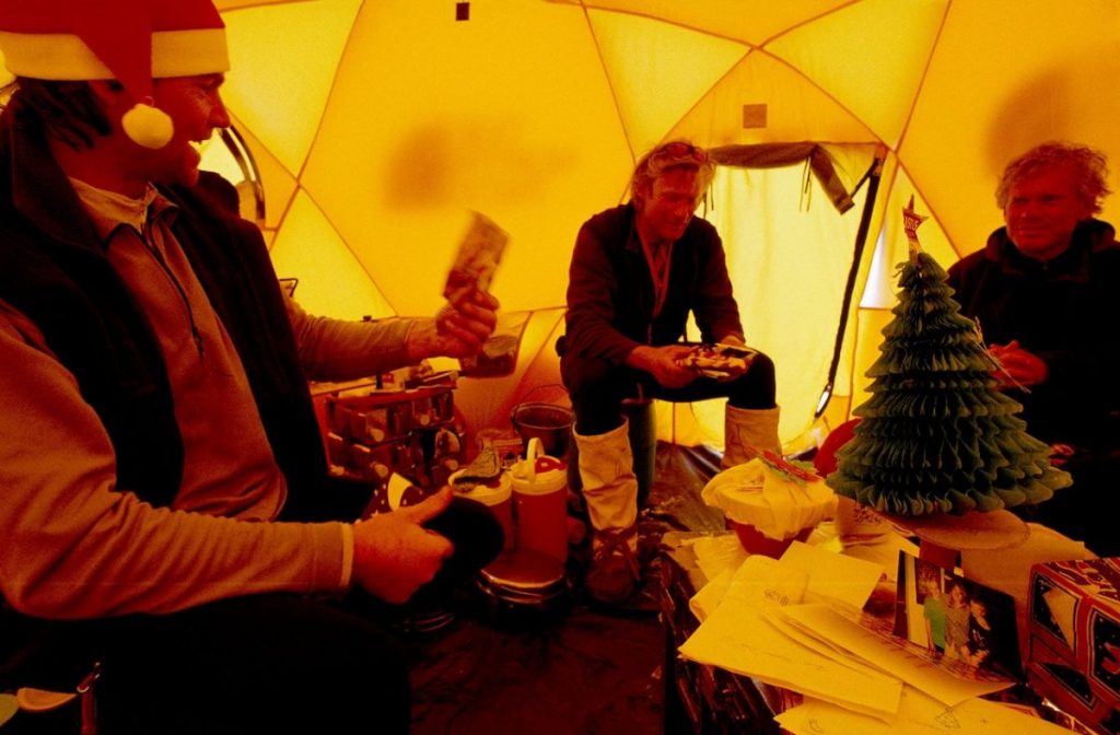 ช่วงปลายทศวรรษ 90 ทีมสำรวจ 6 คนได้เดินทางสำรวจและปีนขึ้นไปยังส่วนที่ยังไม่ถูกบันทึกในแผนที่ของทวีปแอนตาร์ติกา ภาพนี้ ทีมงานกำลังฉลองวันคริสต์มาสด้วยการเล่นเกมแลกการ์ด