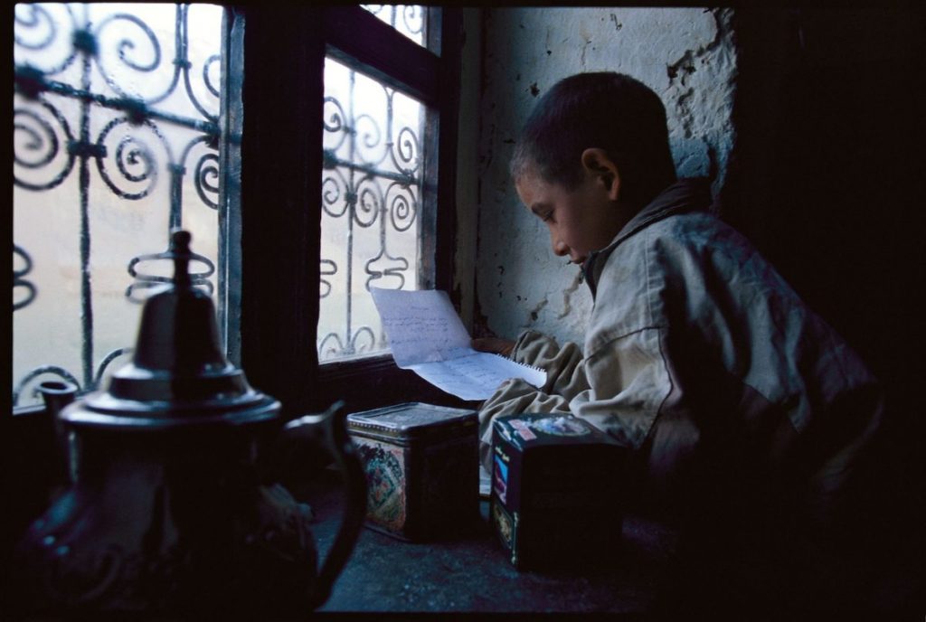 เด็กชายชาวเบอร์เบอร์ในหมู่บ้านชนบทของโมร็อกโกกำลังอ่านกระดาษที่เขียนด้วยอักษรอาหรับ เรื่องราวฉบับมกราคม 2005 บันทึกชีวิตและวัฒนธรรมของชาวเบอร์เบอร์ ซึ่งเป็นกลุ่มชนพื้นเมืองทางตอนเหนือของแอฟริกา