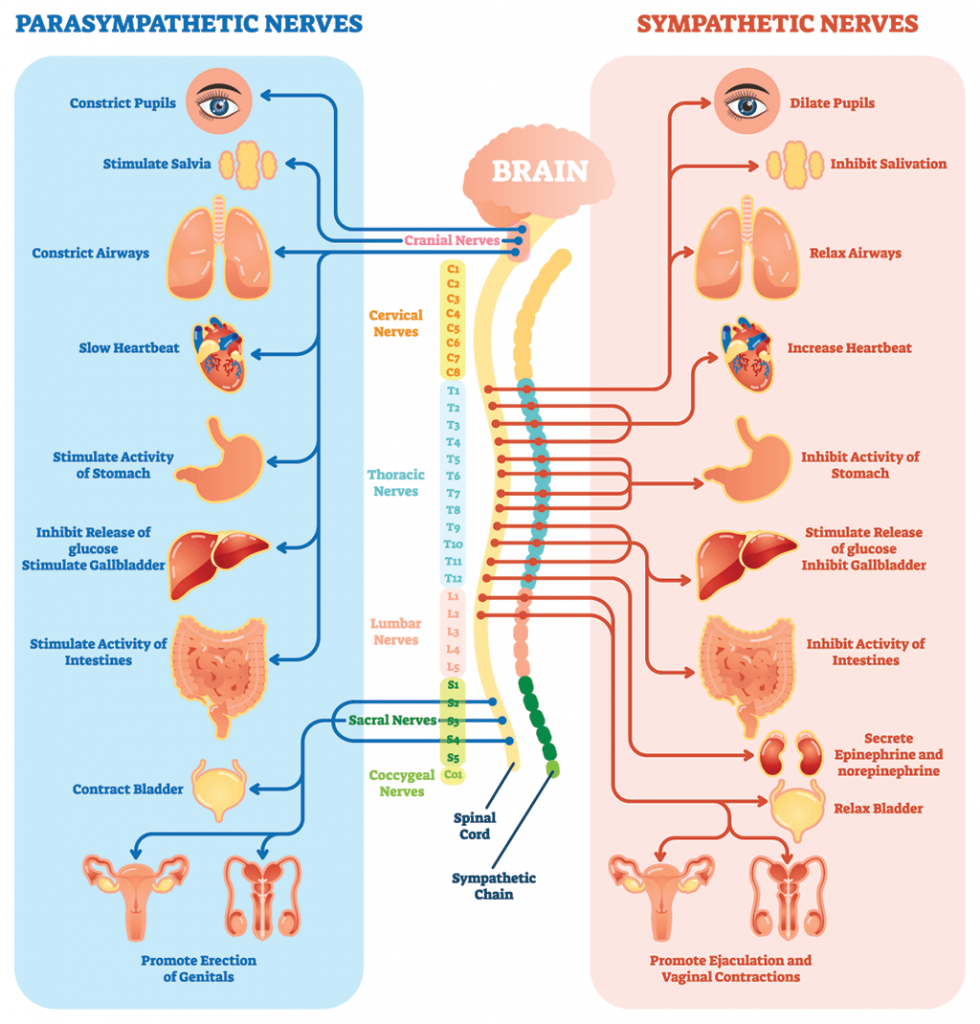 - ระบบประสาทพาราซิมพาเทติก (Parasympathetic Nervous System) มีศูนย์กลางอยู่ที่ก้านสมอง (Medulla) และไฮโปทาลามัส (Hypothalamus) เป็นระบบที่ถูกนำมาใช้เมื่อระบบซิมพาเทติกทำงานสิ้นสุดลง เพื่อให้ร่างกายได้ผ่อนคลายและปรับสมดุลเข้าสู่สภาวะปกติ โดยก่อให้เกิดปฏิกิริยาตอบสนอง เช่น อัตราการเต้นของหัวใจช้าลง กระเพาะอาหารและลำไส้ทำงานได้ดีขึ้น และหลั่งน้ำลายได้ตามปกติ เป็นต้น
