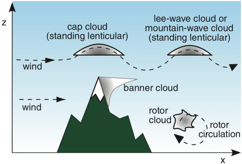 การยกตัวขึ้นของมวลอากาศบางส่วนหลังเทือกเขา (Leeside Upwelling) และกระแสลมรอบเทือกเขาที่ทำให้เกิดการไหลวนของกระแสอากาศบริเวณปลายยอดในด้านหลังลม ก่อตัวเป็นเมฆรูปธงจากการไหลของกระแสอากาศที่เคลื่อนที่ด้านหลังเทือกเขา ทำให้เมฆรูปธงที่ก่อตัวขึ้นมีลักษณะคล้ายกับหิมะที่พัดพามาจากยอดเขา