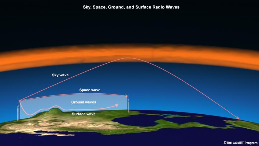 2. คลื่นฟ้า (Sky Wave) หมายถึง คลื่นที่เดินทางจากสายอากาศของสถานีขึ้นไปยังชั้นบรรยากาศของโลกจนถึงชั้นไอโอโนสเฟียร์ที่สะท้อนคลื่นกลับมายังสายอากาศสถานีรับบนภาคพื้นดิน