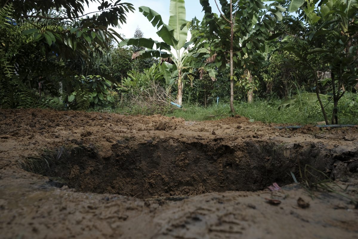 2. ขุดบ่อให้ทะลุชั้นหน้าดิน โดยขนาดและความลึกของบ่อขึ้นอยู่กับสภาพและชั้นดินของแต่ละพื้นที่ (ในกรณีศึกษาครั้งนี้ขุดที่ความลึกประมาณ 2 เมตร ความกว้างปากบ่อ ประมาณ 1 เมตร) และใช้วงบ่อซีเมนต์เพื่อป้องกันดินทลาย ในกรณีขุดเจาะในช่วงหน้าฝน