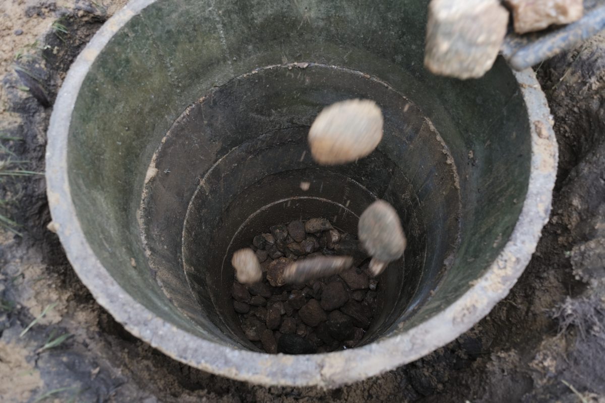 3. สร้างชั้นแรกของธนาคารน้ำใต้ดิน นำเศษวัสดุขนาดใหญ่ที่มีช่องว่างให้น้ำสามารถไหลผ่านได้ โดยเน้นการใช้วัสดุจากธรรชาติ เพื่อป้องกันสารเคมีปนเปื้อน เช่น ก้อนหิน เศษปูน หรือเศษวัสดุที่ไม่ย่อยสลายใส่ลงไปในช่องว่างด้านในบ่อให้เต็ม ความสูงประมาณ 20 เซนติเมตร