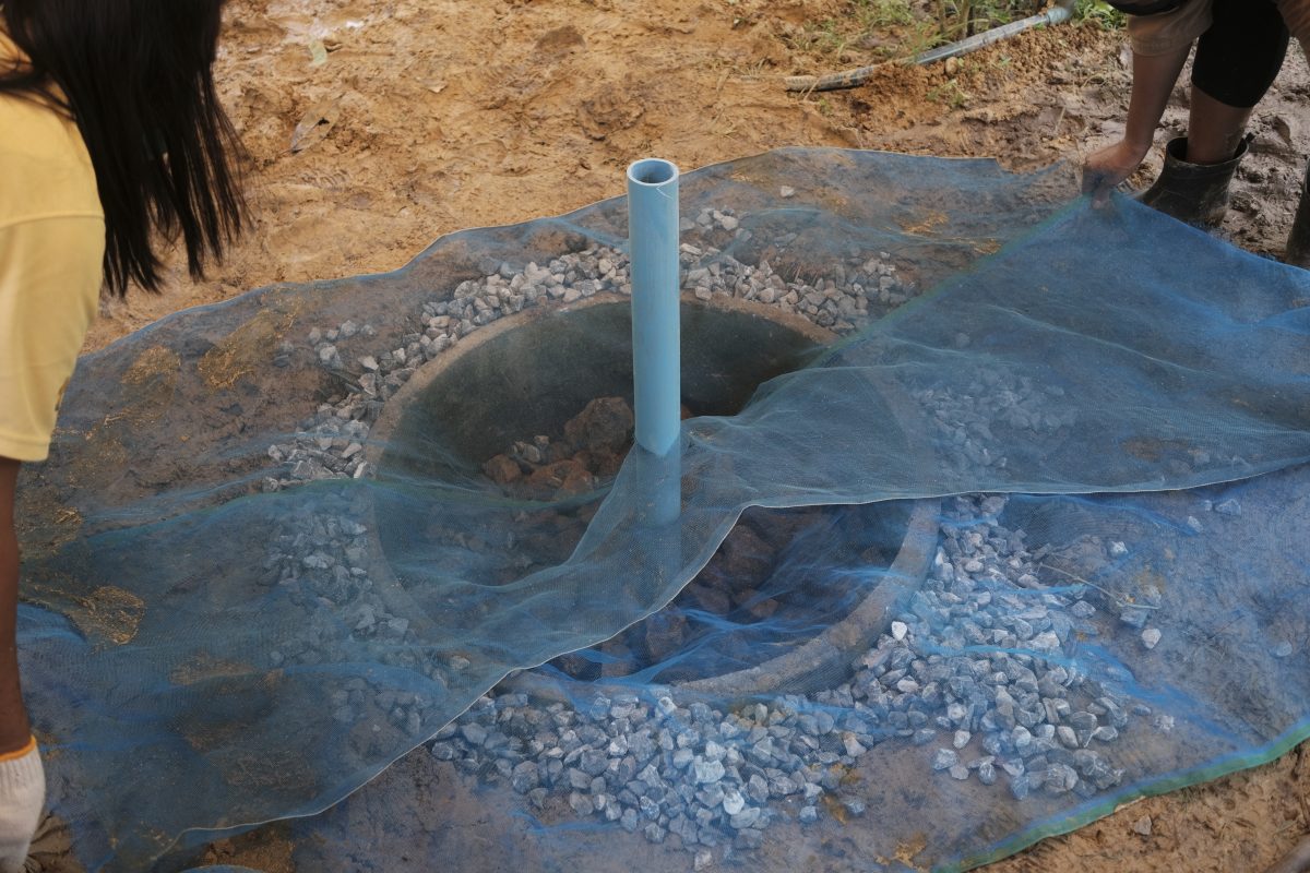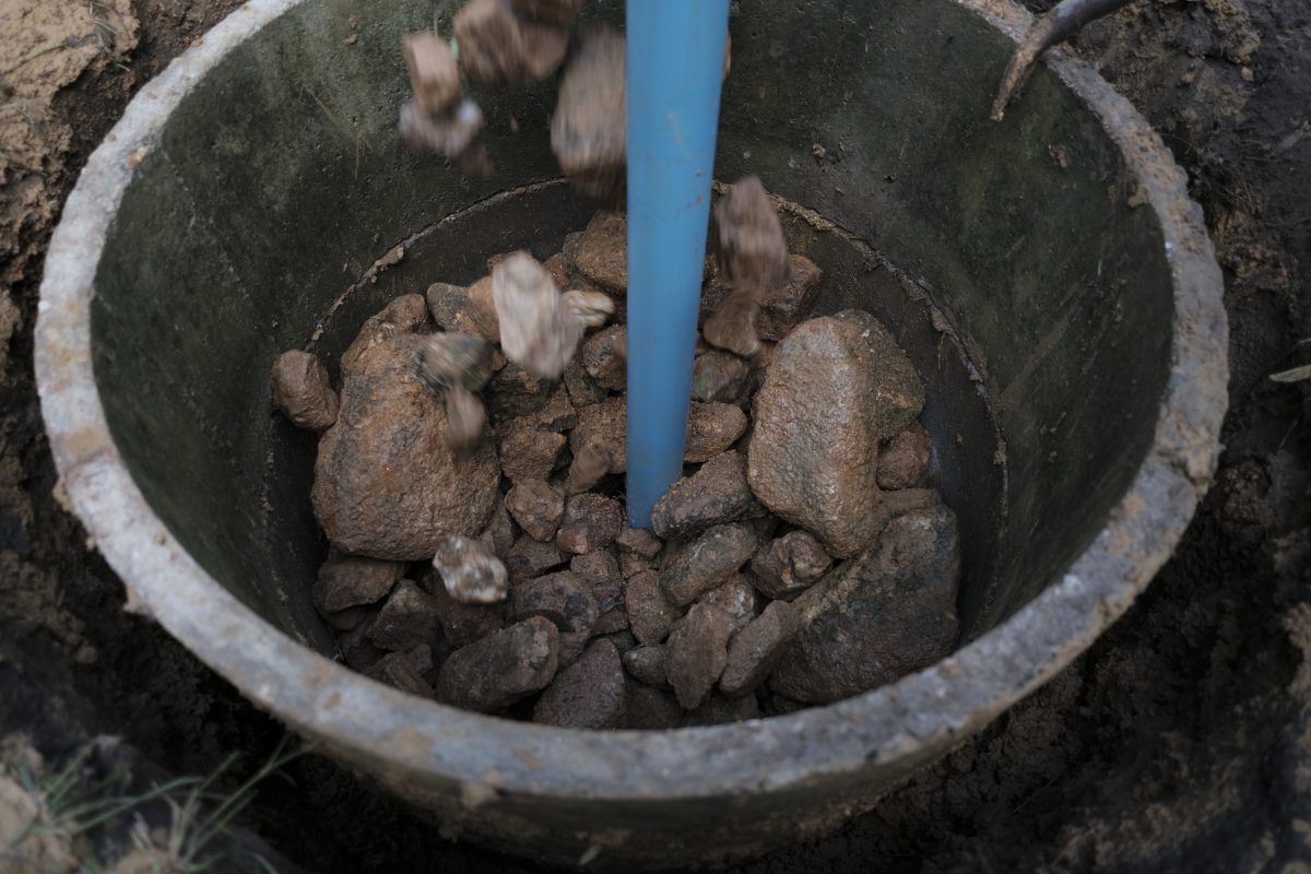 7. ปูทับด้วยวัสดุหยาบหรือก้อนหิน และตามด้วยหินขนาดเบอร์ 1 หนา 10-20 เซนติเมตร จนเสมอปากท่อ เพื่อเป็นตัวกรองไม่ให้เศษดินหรือขยะเข้าไปอุดตัน ทำให้น้ำจากผิวดินไหลลงไปเติมสู่ใต้ดินได้อย่างรวดเร็วและมีประสิทธิภาพ